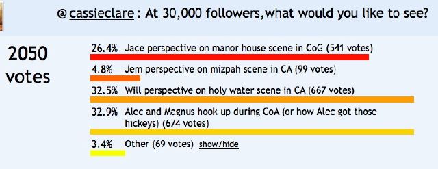 Clare posted a poll, which saw thousands of responses, that included Will’s perspective on the holy water scene in “Clockwork Angel,” Magnus and Alec’s hookup in “City of Ashes” (or how Alec got all those hickeys), Jace’s perspective on manor house scene in “City of Glass” or Jem’s perspective on mizpah scene in “Clockwork Angel.”