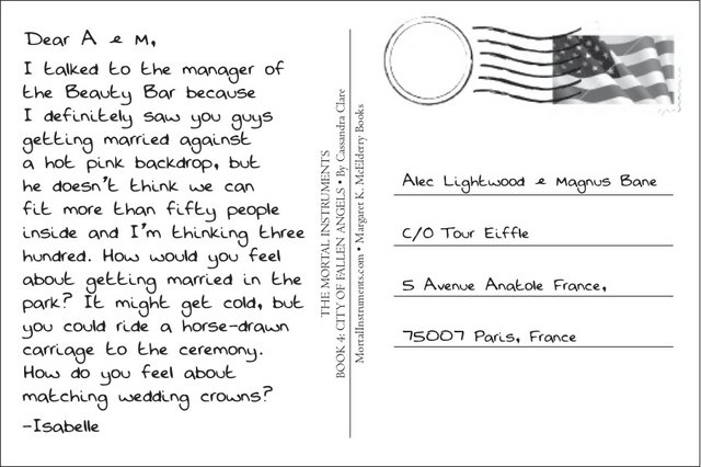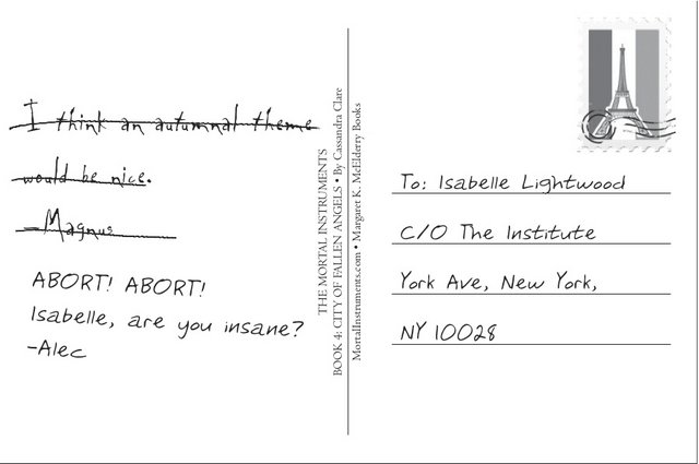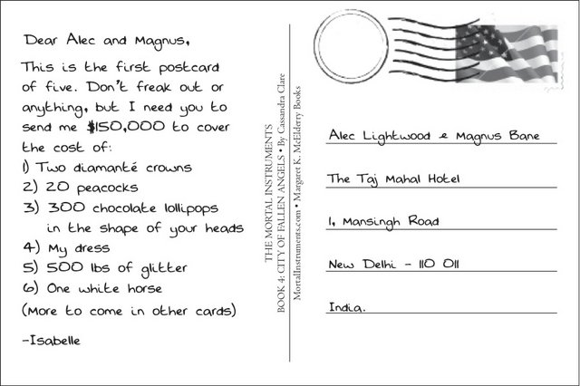"So this is the short story told on the backs of postcards between Magnus, Alec, Isabelle, Jace, Clary and Simon that I brought on tour with me. Now that my USA tour is over I can share it online. It takes place between CoG and COFA while Magnus and Alec are in Europe and doesn't spoil anything."