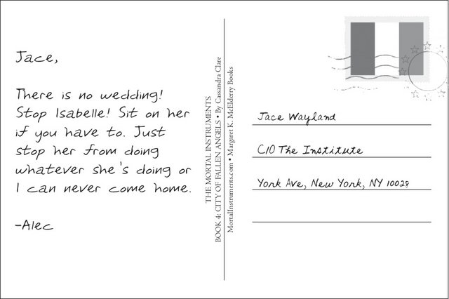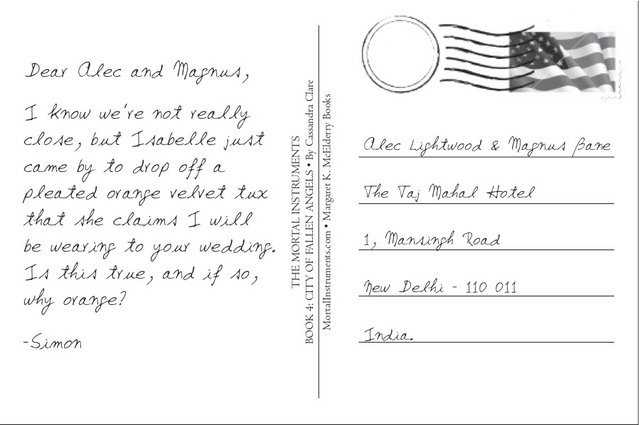 Fans that attended the "City of Fallen Angels/Red Glove" United States tour, featuring Cassandra Clare and Holly Black, were treated to an exclusive short story told by "The Mortal Instruments" characters through special postcards. Now that the tour is over, Clare can share those postcards with fans who weren't able to attend the tour.