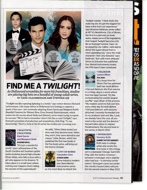 It's a big week for Young Adult books-turning movies in the latest issue of Entertainment Weekly magazine. Jennifer Lawrence graces the cover in the first ever photos of the Oscar-nominated actress as The Hunger Games' heroine Katniss Everdeen and other books that are in the process of making it to the big screen are featured, including "The Mortal Instruments: City of Bones." "Mortal Instruments" is mentioned in a feature titled "Find Me a Twilight," which examines the book series-turning movies that might be the next big Hollywood blockbuster, and they seem to think "Mortal Instruments" has the best shot to take the crown. Here's the excerpt from the story (which is on page 86):