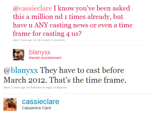 While browsing Tumblr (as I most always do) I came across a post by Fuck Yeah Clary Fray who shared some interesting news from April 2011 about The Mortal Instruments casting news and how it might be coming by March 2012.