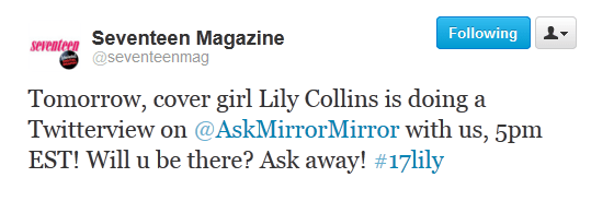 Lily Collins (Clary), who graces the March cover of Seventeen Magazine, will be answering fan-submitted questions on Twitter on Thursday at 5 p.m. EST via the official Mirror Mirror twitter handle.