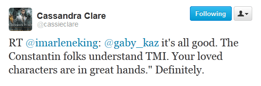 Following a rumor that development on the film adaptation of Cassandra Clare’s bestselling novel The Mortal Instruments: City of Bones had been halted, Clare, Marlene King and Jamie Campbell Bower clarified that it was definitely not the case.