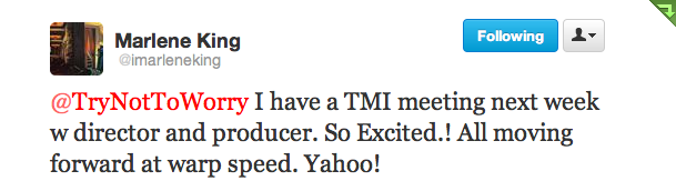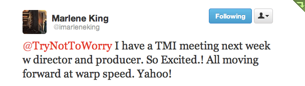 5 Comments on Marlene King Meeting with ‘Mortal Instruments’ Director and Producer on March 6