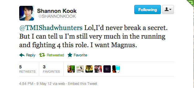 Shannon Kook, who has openly confirmed that he has auditioned for the role of Magnus Bane in the film adaptation of ‘The Mortal Instruments: City of Bones,’ tweeted that he is still “very much in the running” and “fighting” for the role.