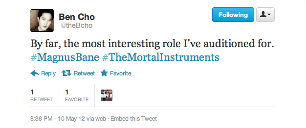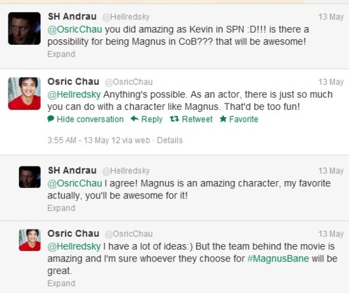 As much as Shannon Kook suits the role of Magnus, and even though I hope he gets it, for some reason I have a feeling that Osric Chau might get it. Funnily enough Supernatural is on TV tonight and I recognised him right away, despite only having seen his pic on here, maybe it’s sign. Hmmm. Shannon Kook would be great though.