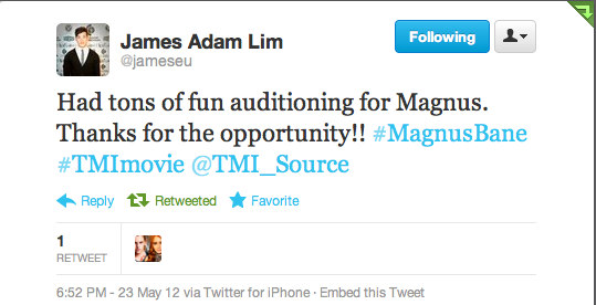 Moments after I published my last post regarding David Sakurai auditioning for Magnus Bane, I received a tweet from Los Angeles-based actor James Adam Lim regarding his audition for Magnus.
