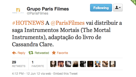 Paris Filmes will distribute The Mortal Instruments: City of Bones for Brazil, according to the studio’s official Twitter.