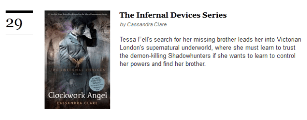I think that The Mortal Instruments and The Infernal Devices should have been No .1 and No .2 instead of No. 21 and No. 29! They’re the best YA series ever!!!!
