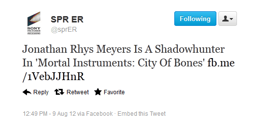 Still waiting on confirmation from Cassandra Clare and for Rhys Meyers’ photo to appear on TheMortalInstrumentsMovie.com, but it looks like this bit of casting news has been confirmed if the studio is reporting it.
