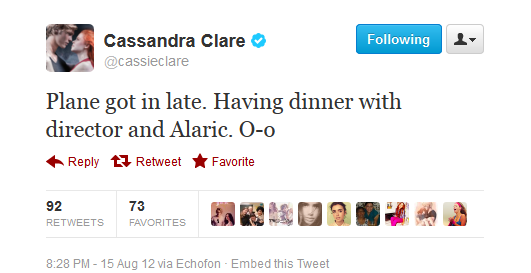 UPDATE: Cassandra Clare touched down in Toronto after a late flight. She had dinner with director Harald Zwart and the un-named actor that has landed the role of Alaric.