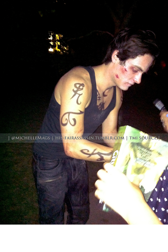 Kevin Zegers was wearing his skin tight pants with black sleevless shirt, runes all over his arm and neck and one make up gash on his right eyebrow (of course I remember).     Mr. SideBurnsGuy said they had to go as “the herd” was rushing in. I bid my love goodbye and thank you and he grinned and said “welcome” and seriously, my knees went jelly and I couldn’t stop shaking, even when was walking away! Although, I did come to my senses and pulled my camera out to snap a few photographs of him.