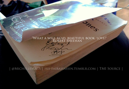 Because I didn’t have a pen again, my savior Maia lent me her pen. Rob signed mine and I said “thank you so much!” and he goes “you’re welcome, love!” Oh the way his tongue rolls at that word, thank you Robert Sheehan’s accent!