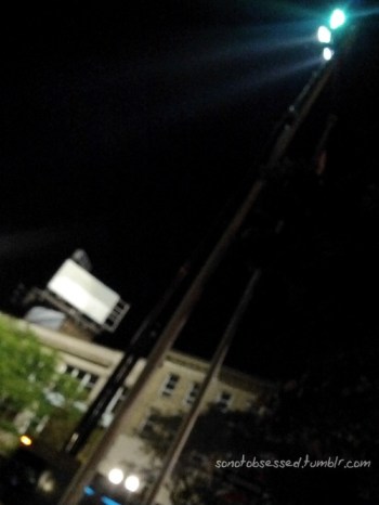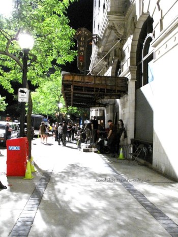 When I came there was no one there, and the spot where all the fans used to be was occupied by crew members eating, so I decided to be polite, and I sat a little farther. There wasn’t much going on at that point. It was dark, and policemen were on set, directing traffic away. It was pretty clear they intented to film something outside, what with the humongous light vehicle that was parked in front of the hotel (really impressive, when up, the lights were at least 7 stories high!)