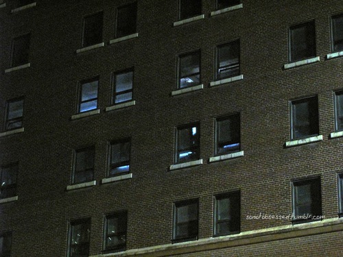 At some point, someone (some more fans got there around 9PM) noticed that one of the windows on the upper floors on the side of the building was lit in some kind of blue light. Since this building is abandoned, we were all curious, and sure enough, we could see shadows walk by, and even hear strange noises and screams coming out of it. Pretty wicked, can’t wait to see it!