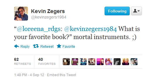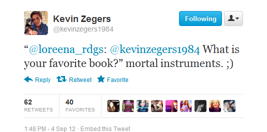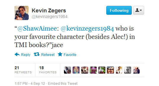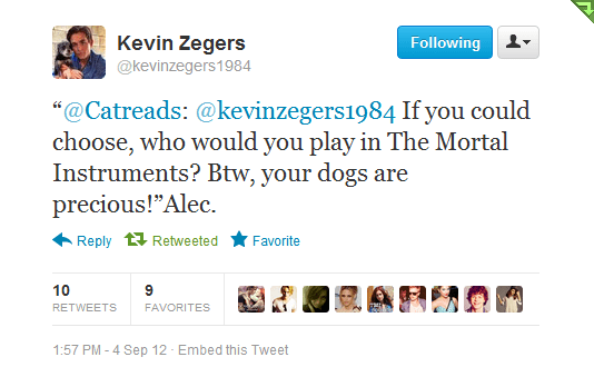 For anyone who wants to see his other answers TMI Insitute compiled them on tumblr: http://themortalinstitute.tumblr.com/post/30880370742/kevin-zegers-tweets-lucky-tmi-fans