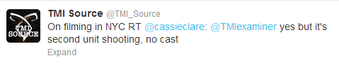 Cassandra Clare, who plans to remain in Toronto until filming concludes, revealed on Twitter that the second unit will be filming in NYC.