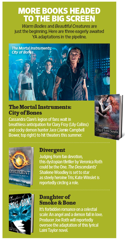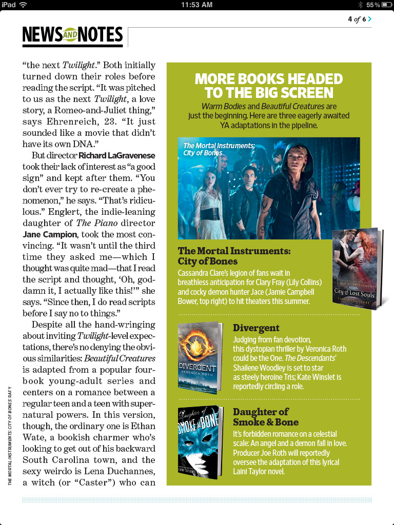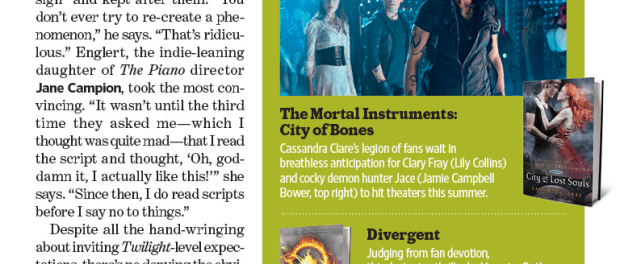 Be sure to pick up a copy of this week’s Entertainment Weekly (on stands Friday) as The Mortal Instruments: City of Bones gets a mention in an article discussing anticipated Young Adult book-to-film adaptations.