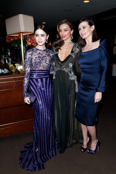 WEST HOLLYWOOD, CA - FEBRUARY 24: (EXCLUSIVE ACCESS SPECIAL RATES APPLY; NO NORTH AMERICAN ON-AIR BROADCAST UNTIL FEBRUARY 28, 2013) (L-R) Actress Lilly Collins, model Miranda Kerr, and actress Emily Mortimer attend the 2013 Vanity Fair Oscar Party hosted by Graydon Carter at Sunset Tower on February 24, 2013 in West Hollywood, California. (Photo by Jeff Vespa/VF13/WireImage)