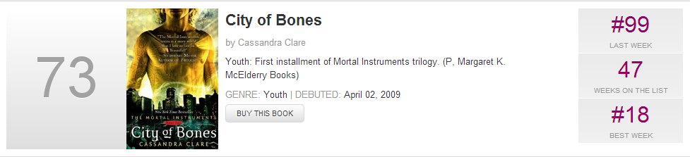On the New York Times bestsellers list, The Infernal Devices and The Mortal Instruments hold the #5 and #6 spots, respectively, on the Young Adult series lists.