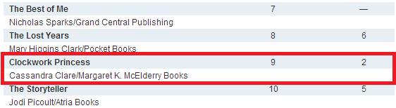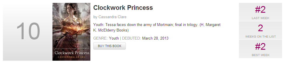 In its second week, Clockwork Princess is holding strong in the Top 10 in USA Today’s Best Sellers list at No. 10. City of Bones, which has spent 47 weeks on the list, moved up 26 spots to No. 73 this week.