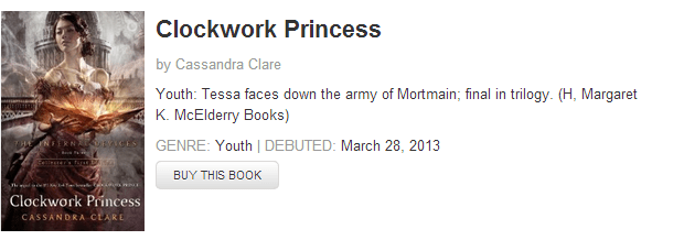The Infernal Devices and The Mortal Instruments continue to dominate the various best sellers lists, including Clockwork Princess, which holds on to Top 10 spots on the Publisher’s Weekly and USA Today best seller lists.