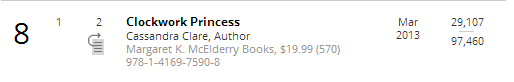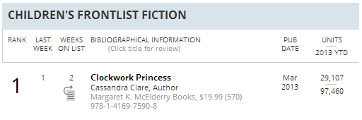On the Publisher’s Weekly best seller list, Clockwork Princess holds strong in the overall Top 10 at #8, as well as occupying the #1 spot in Children’s Frontlist Fiction. In two weeks, Clockwork Princess has sold more than 97,000 copies.