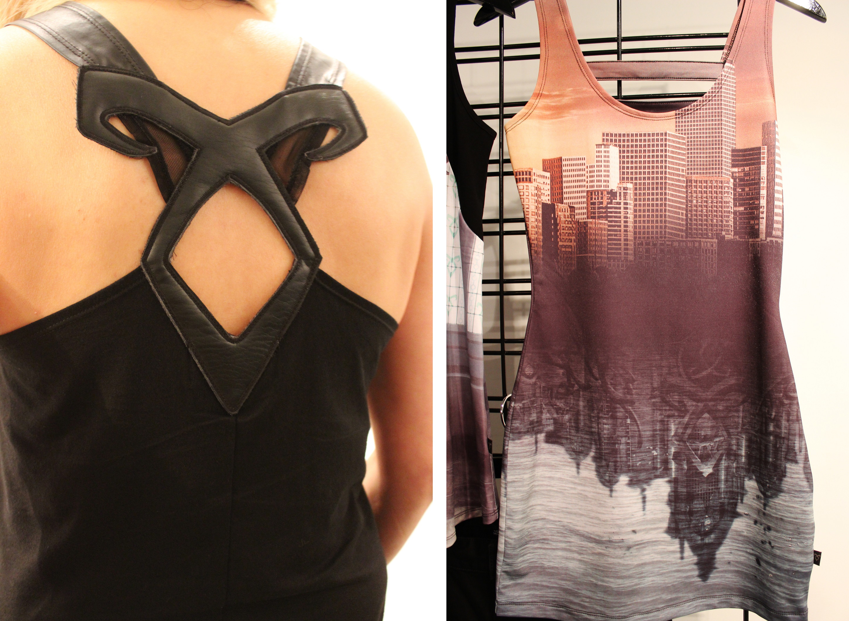 TMI Source got a sneak peek of the Mortal Instruments clothing line Friday in New York City, which features tank tops, dresses, leggings and moto jackets and vests brandished with Angelic Power runes and prints from the film and movie poster. The prices range from $29.50-$54.50.