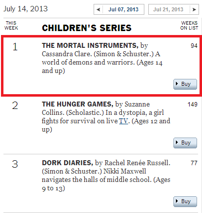 The Mortal Instruments knocked of The Hunger Games, which frequents the top spot. The Mortal Instruments has now been on the New York Times Best Sellers list for 94 straight weeks.