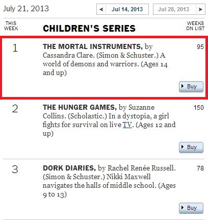 The Mortal Instruments continued to hold off The Hunger Games, which frequents the top spot. The Mortal Instruments has now been on the New York Times Best Sellers list for 95 straight weeks.