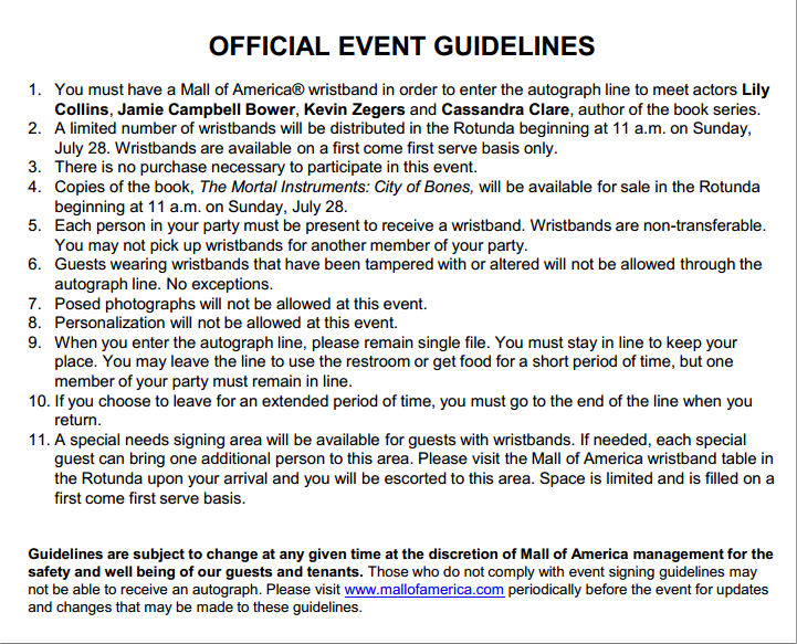 Event guidelines for ‘MORTAL INSTRUMENTS’ cast appearance at Mall of America on July 28