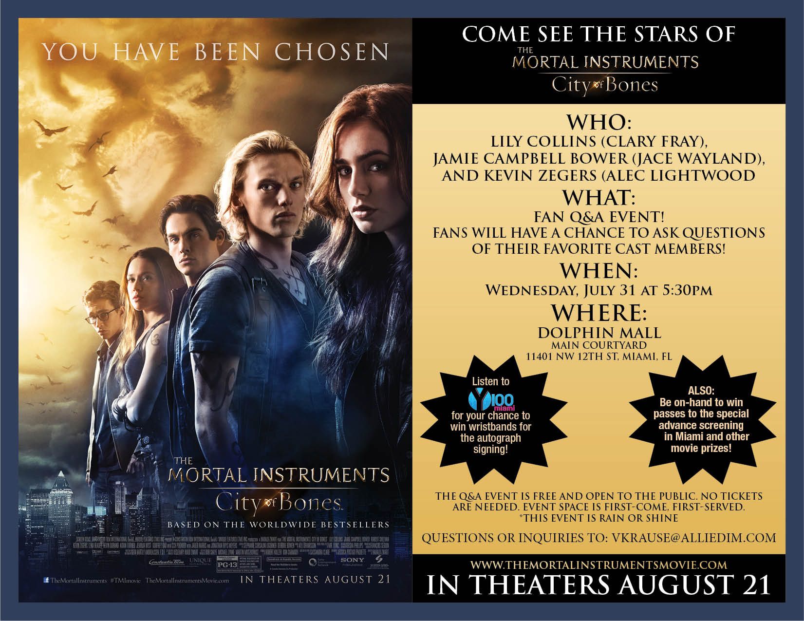 Thanks to Literary Beginnings & Red Carpet Endings fans of The Mortal Instruments: City of Bones can watch Lily Collins, Kevin Zegers and Jamie Campbell Bower’s mall tour stop in Miami, FL.