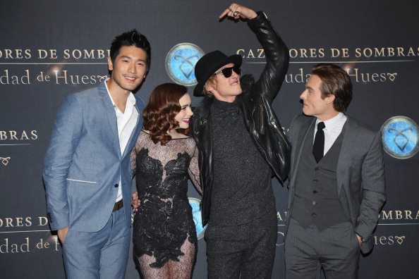 MEXICO CITY, MEXICO - AUGUST 27: (L-R) Godfrey Gao, Lily Collins, Jamie Campbell Bower and Kevin Zegers attend The Mortal Instruments: City of Bones" Mexico City screening at Auditorio Nacional on August 27, 2013 in Mexico City, Mexico. (Photo by Victor Chavez/WireImage)