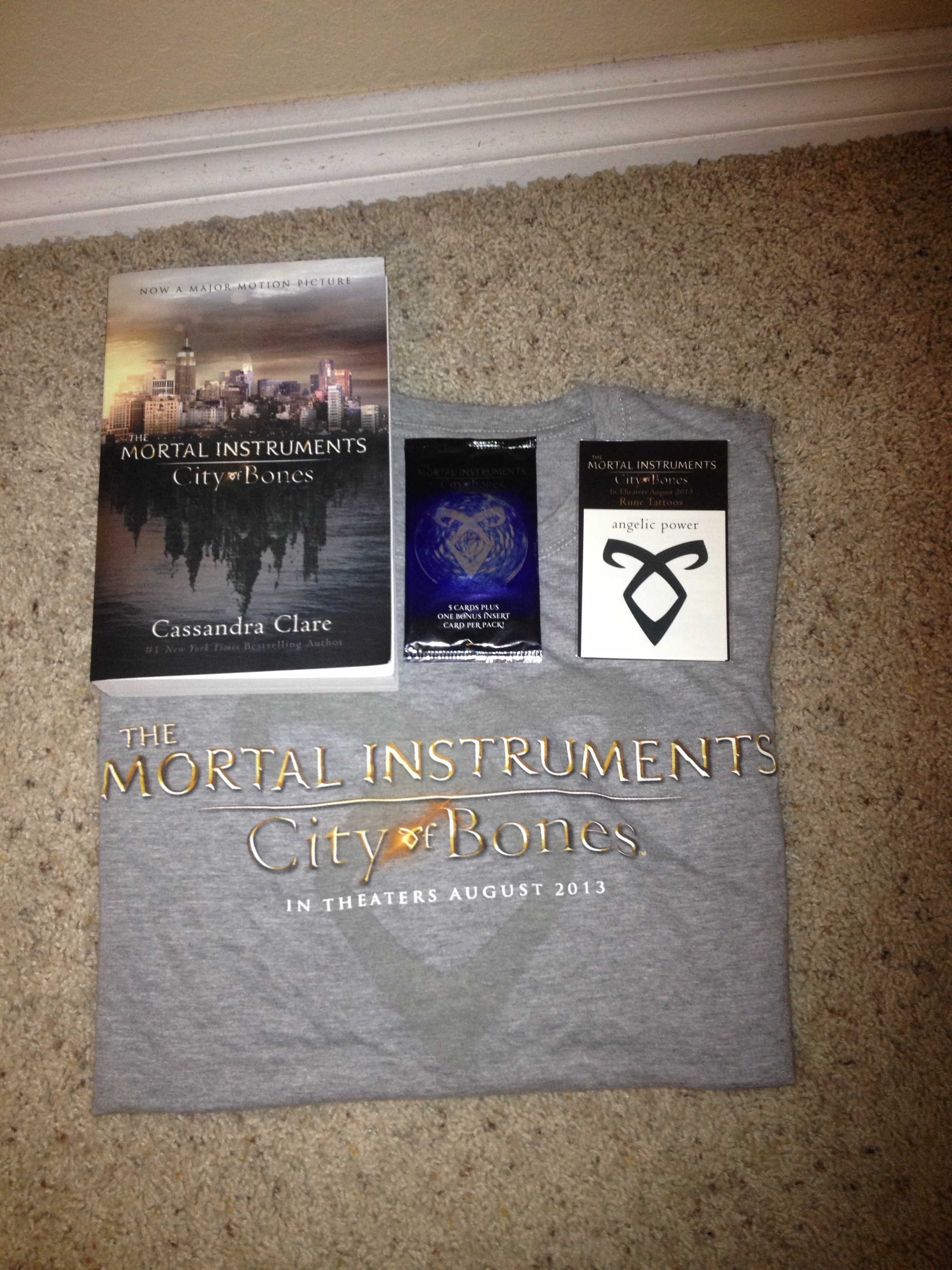 This prize pack will include (1) City of Bones movie tie-in novel, (1) gray Mortal Instruments: City of Bones t-shirt, (1) pack of temporary rune tattoos and (1) trading card set.