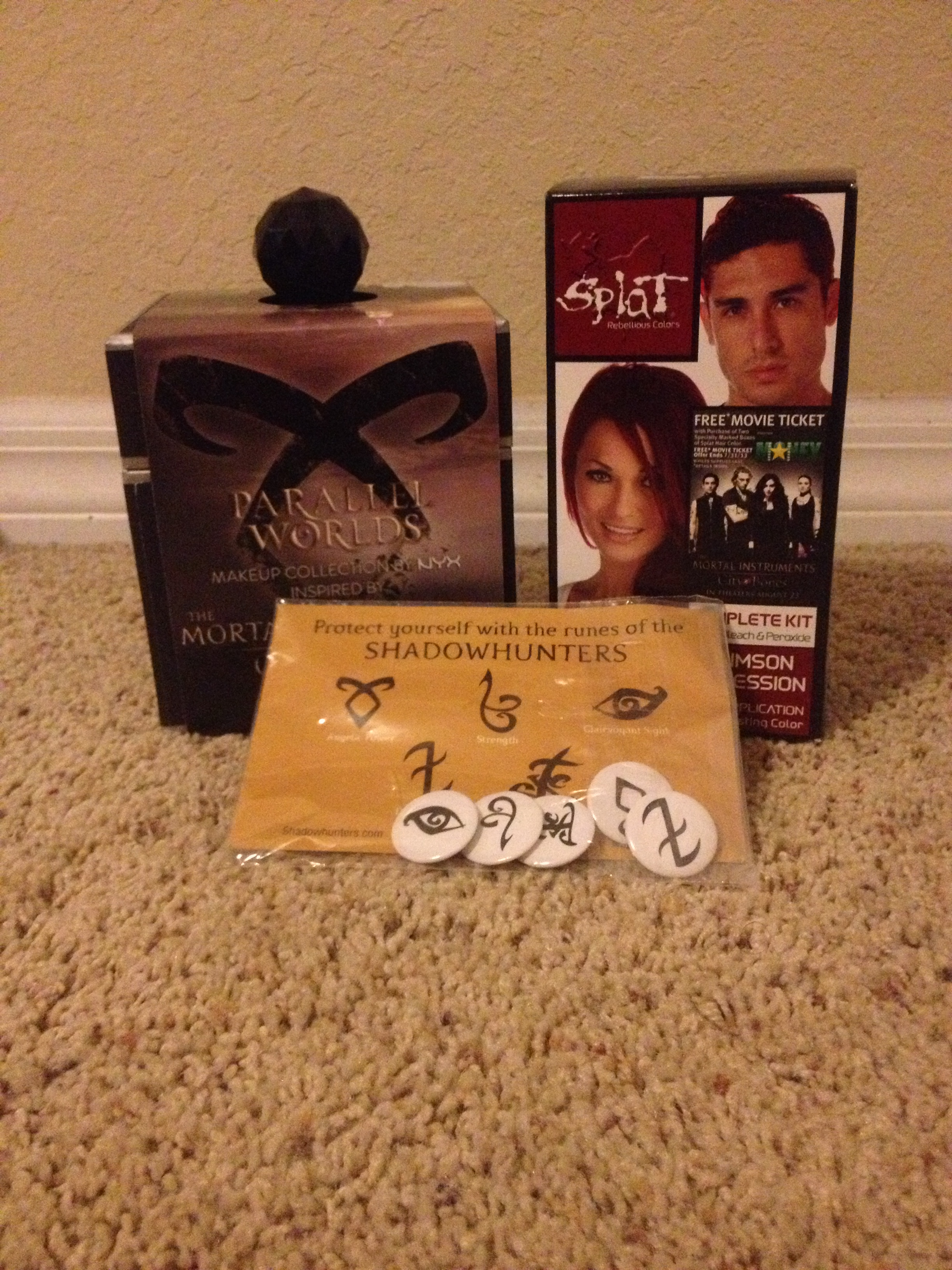 This prize pack will include (1) Mortal Instruments Parallel Worlds make up kit from NYX, (1) Splat hair dye kit featuring Mortal Instruments and (1) pack of rune buttons.