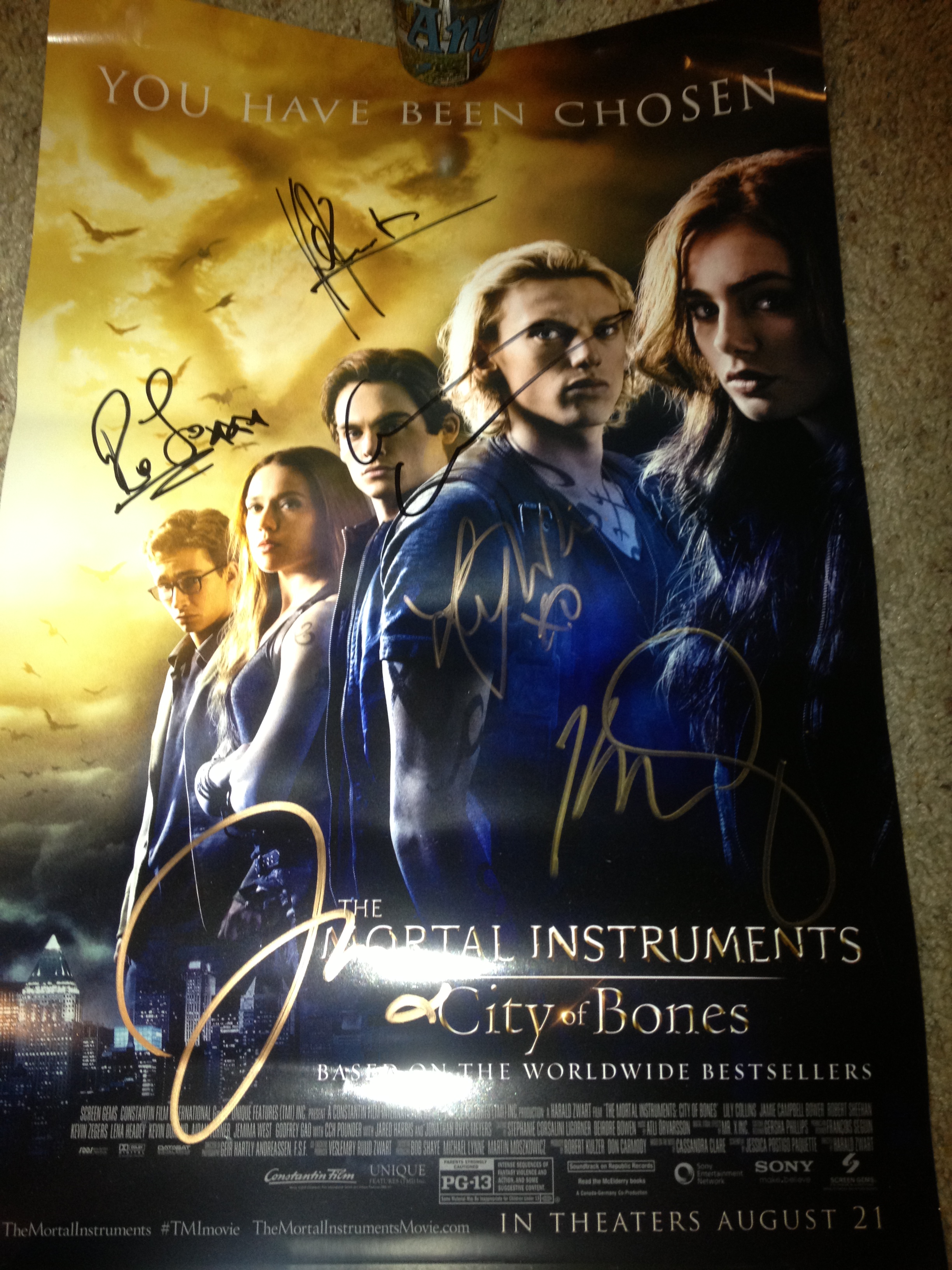 The grand prize will be a Mortal Instruments: City of Bones mini poster signed by Cassandra Clare, Lily Collins, Jamie Campbell Bower, Robert Sheehan, Kevin Zegers and Harald Zwart. This prize will be awarded to the person that sees The Mortal Instruments: City of Bones the most times from Friday through Sunday. They must be different showings and be sure to keep your ticket stubs for proof.