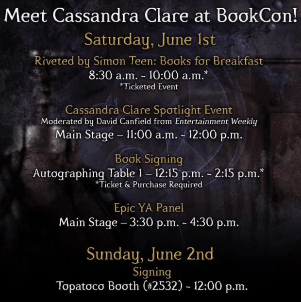 We’re just about a week away from BEA and BookCon and Shadowhunter Chronicles will be well-represented!